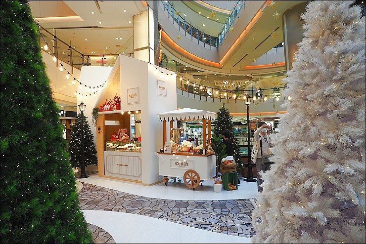 我很喜歡大江一樓中庭的天井設計,讓購物商場光線非常充足明亮,中庭有流水設計,結合陽光、空氣、水三大元素,就像是個會呼吸的購物中心,逛起來非常舒服自在。三樓空橋周末下午會有表演,往外走也有空中廊道,日落時分及夜景很有看頭。這次年底聖誕季,大江特別打造白色聖誕市集,木造房屋、各種大大小小的聖誕樹、聖誕裝飾及燈飾,超有氣氛的,勘稱桃園最大聖誕市集,每次到大江都有不同的驚喜!